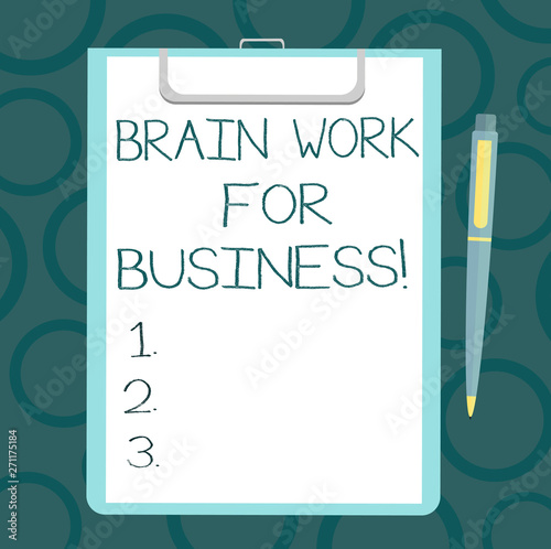 Writing note showing Brain Work For Business. Business photo showcasing Brainstorming creative job inspiration thinking Sheet of Bond Paper on Clipboard with Ballpoint Pen Text Space