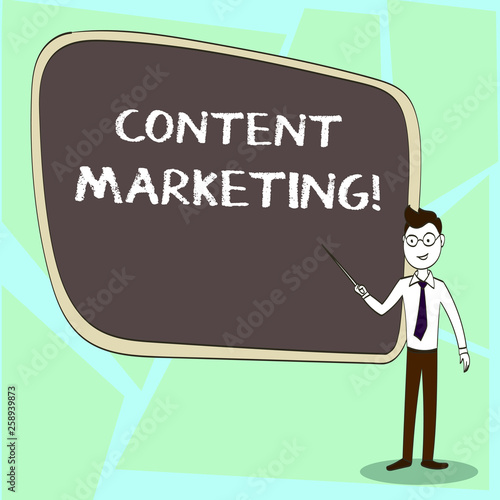Writing note showing Content Marketing. Business concept for involves creation and sharing of online material Confident Man in Tie, Eyeglasses and Stick Pointing to Board
