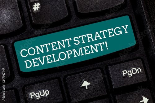 Writing note showing Content Strategy Development. Business photo showcasing setting some goals for the marketing content Keyboard key Intention to create computer message pressing keypad idea