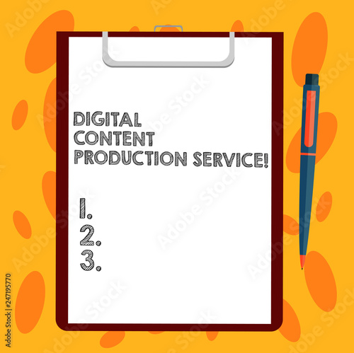 Writing note showing Digital Content Production Service. Business photo showcasing New ways of marketing advertising Sheet of Bond Paper on Clipboard with Ballpoint Pen Text Space