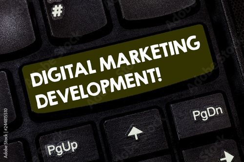 Writing note showing Digital Marketing Development. Business photo showcasing Leverage the digital channels in marketing Keyboard key Intention to create computer message pressing keypad idea