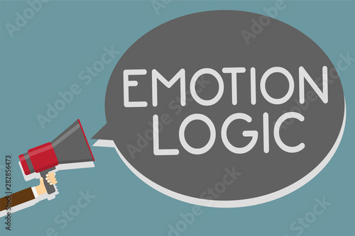 Writing note showing Emotion Logic. Business photo showcasing Heart or Brain Soul or Intelligence Confusion Equal Balance Man holding megaphone loudspeaker speech bubble message speaking loud