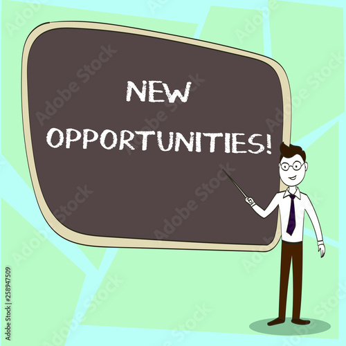 Writing note showing New Opportunities. Business concept for exchange views condition favorable for attainment goal Confident Man in Tie, Eyeglasses and Stick Pointing to Board
