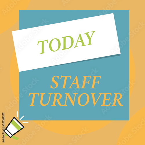Writing note showing Staff Turnover. Business concept for The percentage of workers that replaced by new employees Big blank square rectangle stick above small megaphone left down corner