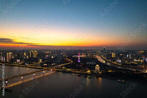 Wuhan Yangtze River Hubei cityscape glows as the sun sets painting the sky with vibrant colors over the water and city lights.