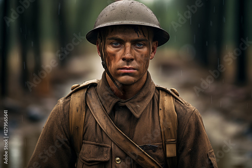 WW1 Soldier - First World War Military Portrait, Historical Army Uniform, Helmet & Rifle - Trench Warfare, History, Courage & Sacrifice. History book.
