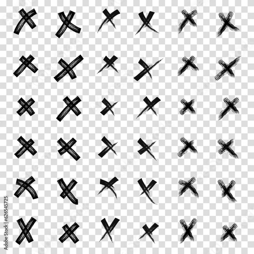 X black mark vector set collection. Cross sign icon from hand brush strokes. Hand drawn doodle scribble crossed brush strokes. Grunge set X. Set black shapes on a isolation transparent background.