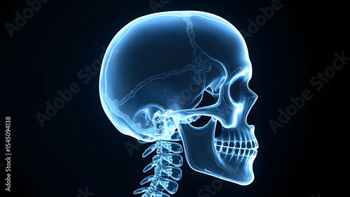 X ray image showcasing skull detailed view of cranium and cervical spine bones glowing in blue light on black background