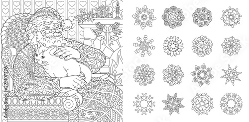 Xmas coloring pages with Santa Claus and snowflakes set