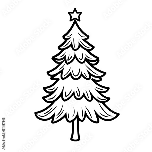 Xmas tree sketch, black and white line art, traditional fir or pine, simple stylized festive winter symbol, isolated vector for Noel