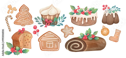 xmas watercolor elements set, traditional christmas cupcakes Italian panettone Stollen Chocolate christmas log English fruitcake Christmas pudding gingerbread cookies. hand drawn isolated illustration