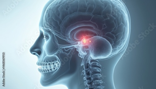 X-ray illustration of brain with aneurysm. Medical scan shows blood vessels, potential hemorrhage, internal human body. Diagnostic image of head with abnormal growth in artery.