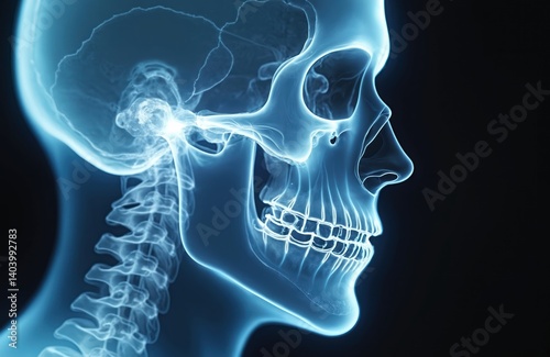 X-ray image of human skull and cervical spine. Medical illustration shows clear view of bones, teeth, jaw and spine. Realistic medical scan of head and neck.