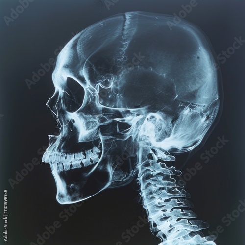 X-ray image showcasing a human skull, detailed view of cranial structure, on a dark background. medical analysis.