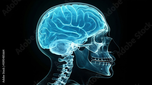 X-ray of human skull with brain, medical mood, seen from side against dark background