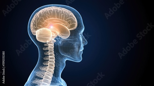 X-ray view highlights a glowing red spot at the temple area, illustrating pain within the human head anatomy on a dark blue backdrop.