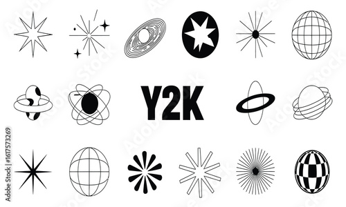 Y2K futuristic retro graphic elements set. Collection of abstract vector shapes, stars, and planets for trendy design.