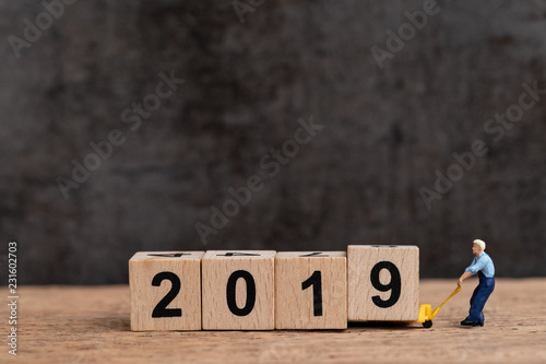 Year 2019 new year changing concept, miniature people worker using forklift moving cube wooden block building number 2019 on wood table with dark blackboard background with copy space