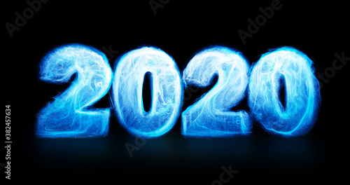 Year 2020 celebration with particles, fluid energy within numbers. Abstract visual for overlay on other compositions. 3D render