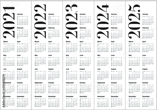 Year 2021 2022 2023 2024 2025 calendar vector design template, simple and clean design