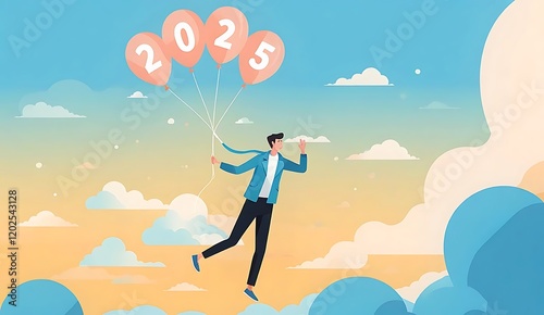 Year 2025 vision, achievement or plan for success, career target or economic forecast, aspiration to work success, new year resolution concept, businessman flying with 2025 balloons with telescope