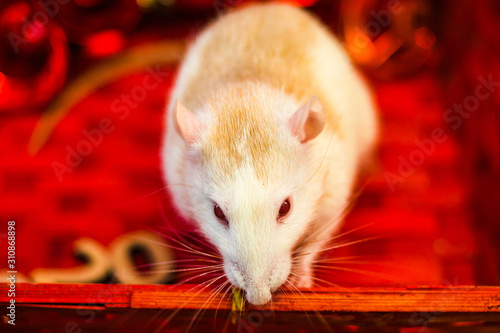 Year of the cute rat. Cute domestic rat in a New Year's decor. Symbol of the year 2020 is a rat.