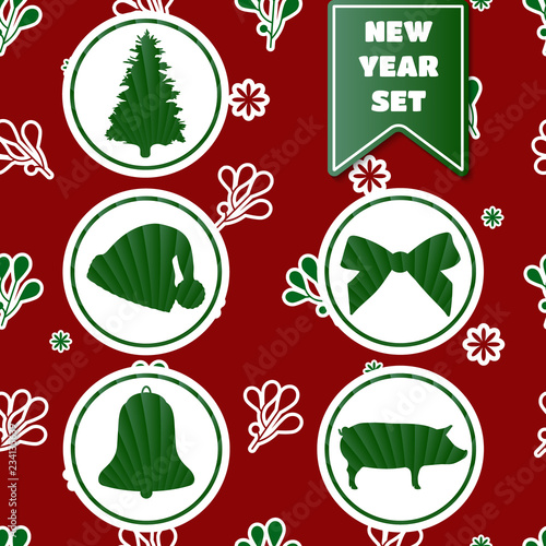 Year of the Pig. 2019 New Year's vector icons set. Pine, pig, bow tie, bell, cap