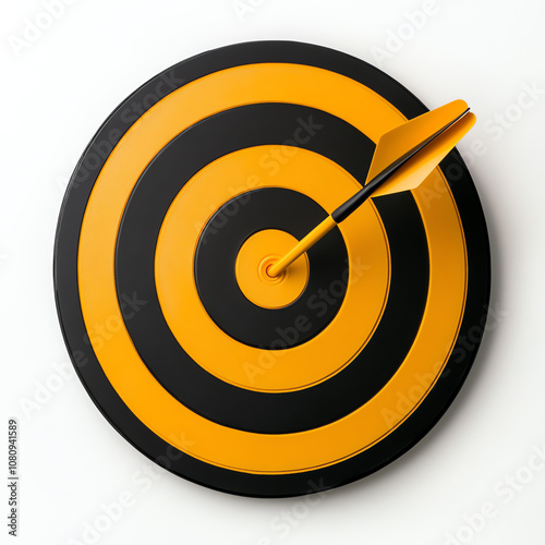 Yellow and Black Bullseye Target with Dart Hitting Center on White Background