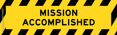 Yellow and black color with line striped label banner with word mission accomplished