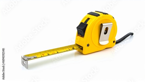 yellow and black retractable tape measure with extended metal tape on neutral background
