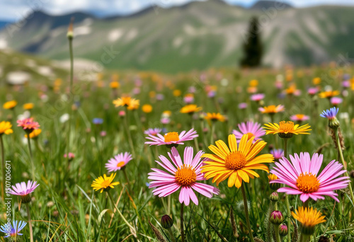 Yellow and pink flowers blooming in sunny mountain meadow with blurred trees