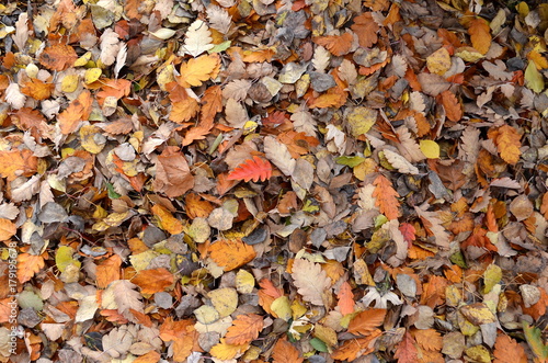 yellow and red fallen leaves on the ground, texture, background