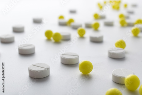 yellow and white pills of medical drugs and vitamins are in the hospital on a white background.