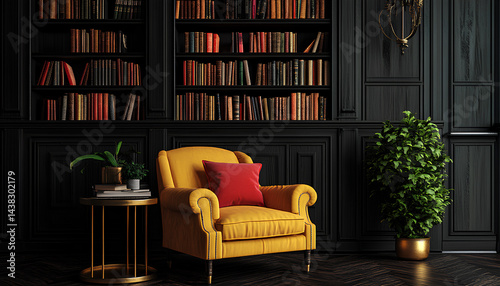 yellow armchair, which has red accents, is situated in a dark, stylish interior