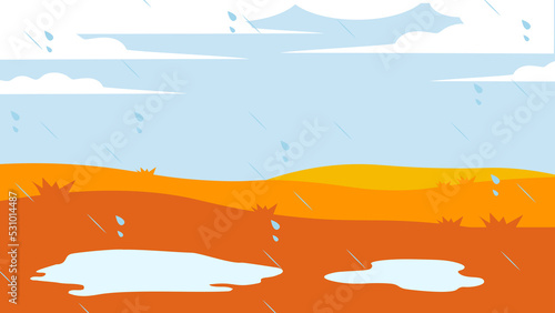 Yellow autumn field in the rain with puddles