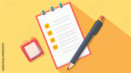 Yellow background with a clipboard and a pencil on it. The clipboard has a to-do list on it with some of the items checked off.