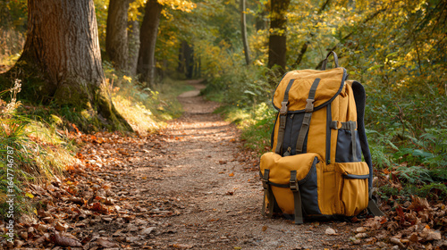 Yellow backpack on forest path autumn sunlight golden leaves outdoor adventure travel hiking peaceful nature trail woodland