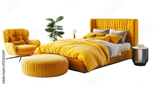 Yellow Bed Interior isolated on transparent background, set of bedroom furniture in contemporary style