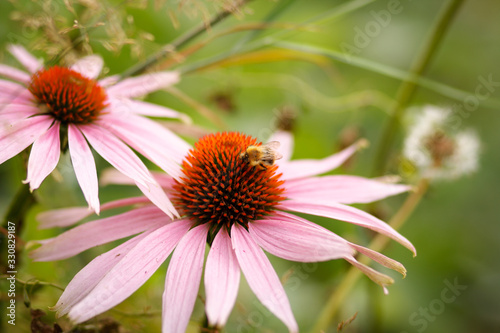Yellow black large bumblebee crawls on pink red Echinacea flower and pollinates. Very beautiful perennial medicinal plant Echinacea on green blurred background, selective focus, view from above