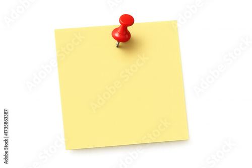 Yellow blank sticky note paper pinned with red pushpin for reminder message on transparent background