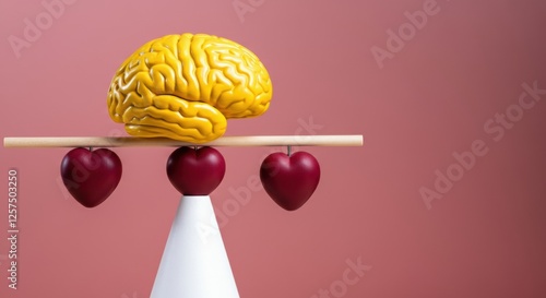 Yellow brain balancing on a scale with red hearts, symbolizing emotions and intellect