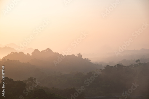 yellow bright multi layer mountain in morning view with mist