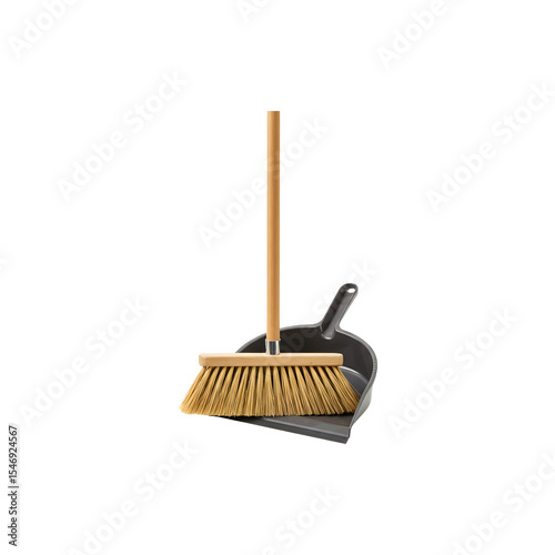 Yellow Broom Standing Upright on White for Cleaning Tools and Domestic Work Concepts