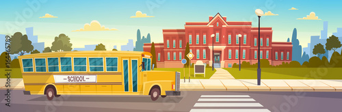 Yellow Bus In Front Of School Building Pupils Transport Flat Vector Illustration