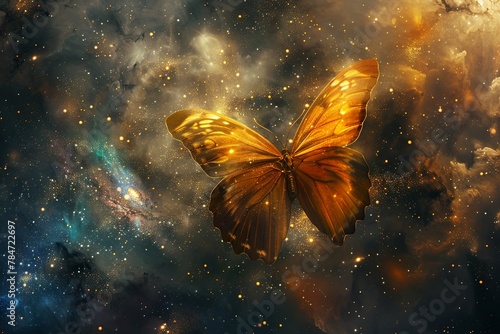 Yellow butterfly gracefully traverses galaxy teeming stars, celestial dance of colors and light