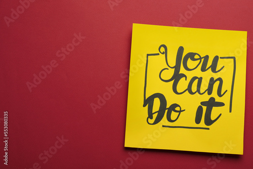 Yellow card with motivational phrase You Can Do It on burgundy background, top view. Space for text