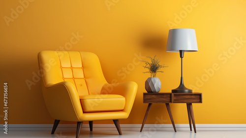 yellow chair in a yellow room with a coffee table and a reading lamp