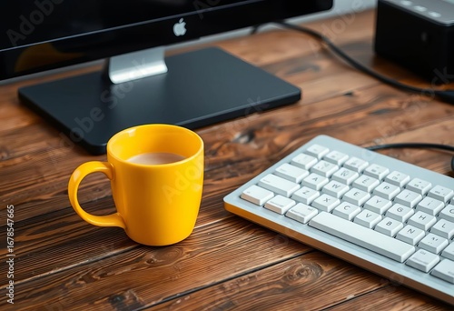 Yellow coffee cup sits beside a computer keyboard on rustic wooden table, afternoon, coffee