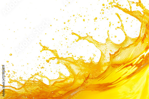 Yellow colored water splashes and drops isolated on transparent background. Abstract background with orange juice wave