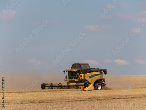 Yellow combine harvesters on the field. Combine harvest on grain field. Summer harvest and blue sky. Harvesting on grain field. Harvests wheat in the fields in summer.